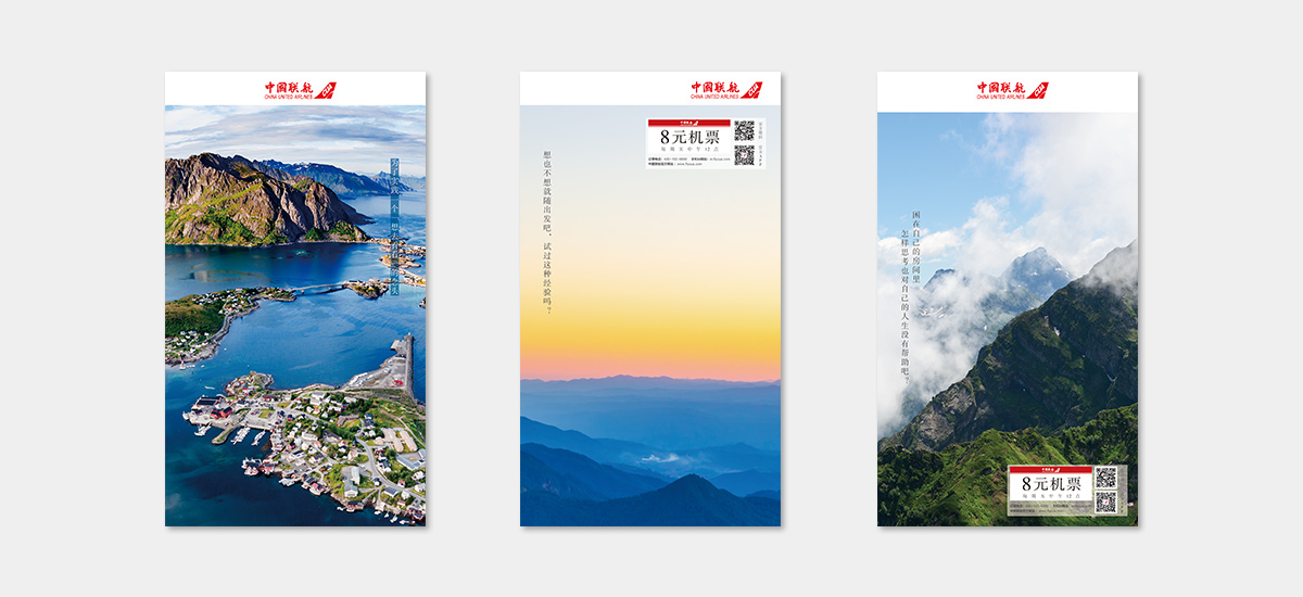 啟止視覺(jué)為中國(guó)聯(lián)合的“8元機(jī)票”活動(dòng)設(shè)計(jì)系列海報(bào)。
